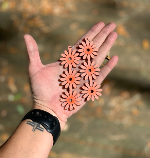 Leather precision cut Flower Dangle earrings. Muted peachy salmon with accents of bright orange in the center. Flower shape and featherlight on the ears! Sides and back sealed with black to prevent fray over time.