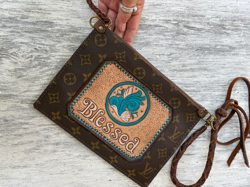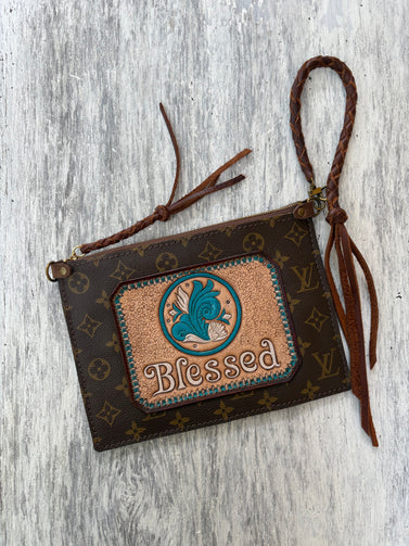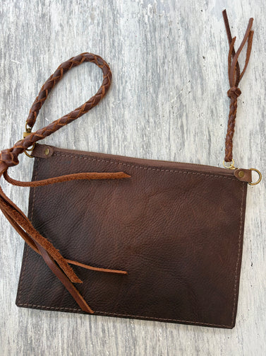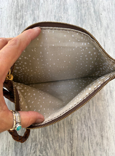 Features a braided zip pull and recycled canvas front, this clutch features an D-ring on each side for optional crossbody carry. All finished in smooth brown edging.