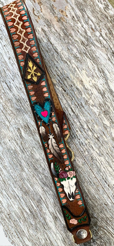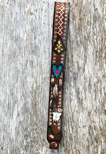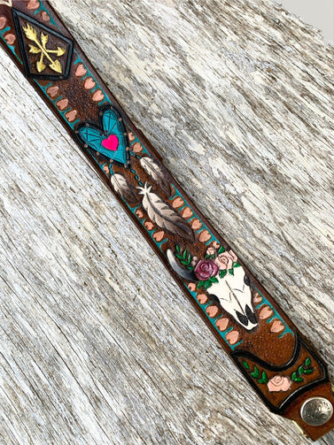 A sweet heart dream catcher with ombré toned feathers and a cow skull!? All darkened with a nice rich antique to compliment all your bags. Each end has a bezel concho and a swing clip for easy use on whichever bag you like. This specific gal is designed to be worn over the shoulder.