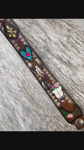 Cowskull and flowers dreamcatcher with feathers handbag strap