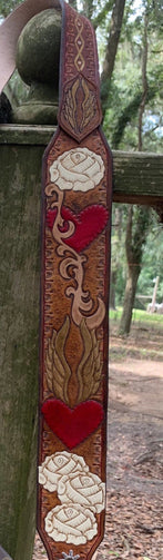 Set on a natural background with winged hearts in red and bronze with beautiful ivory bohemian roses with a deep brown glaze. Ask us how you can get your own personalized color combo!